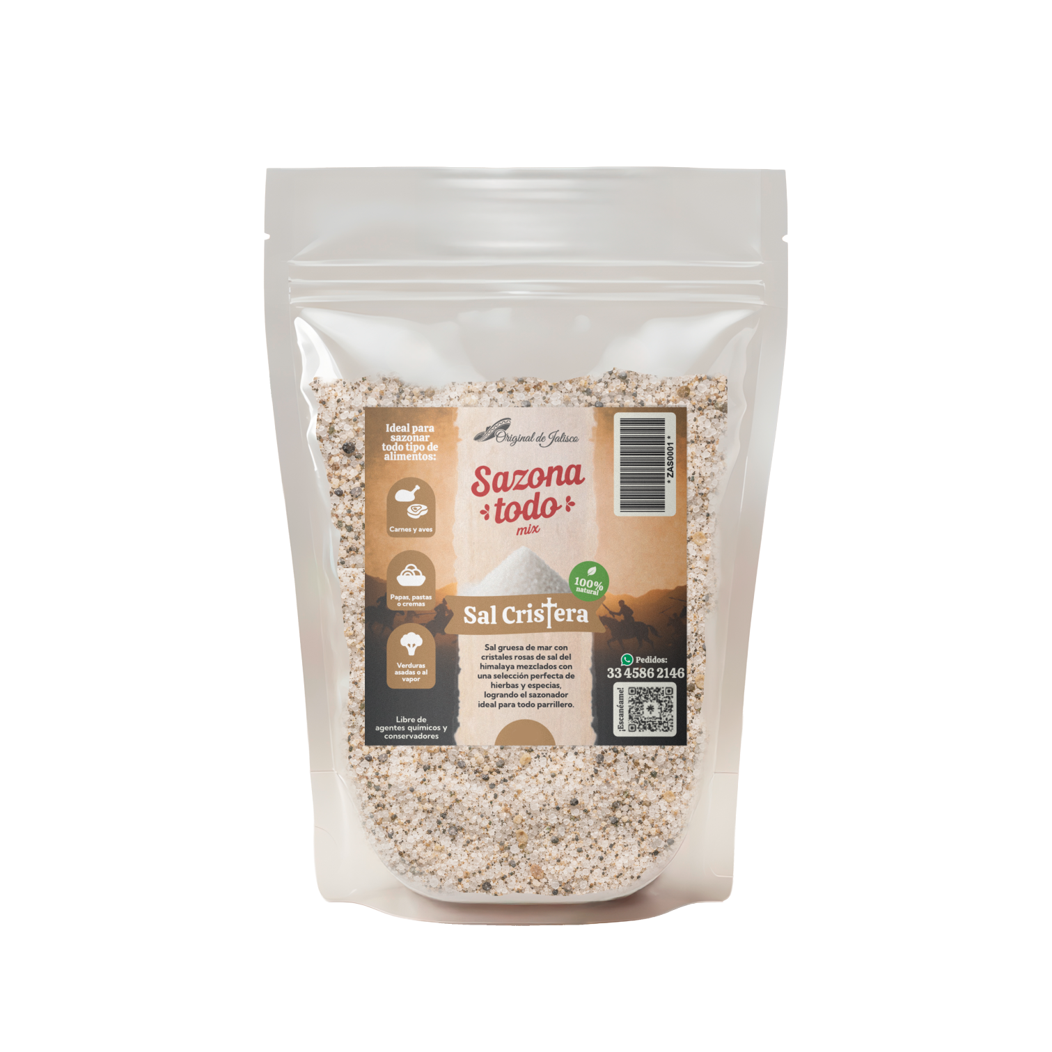 Sal gruesa de mar con cristales rosas de sal del himalaya mezclados con una selección perfecta de hierbas y especias, logrando el sazonador ideal para todo parrillero.