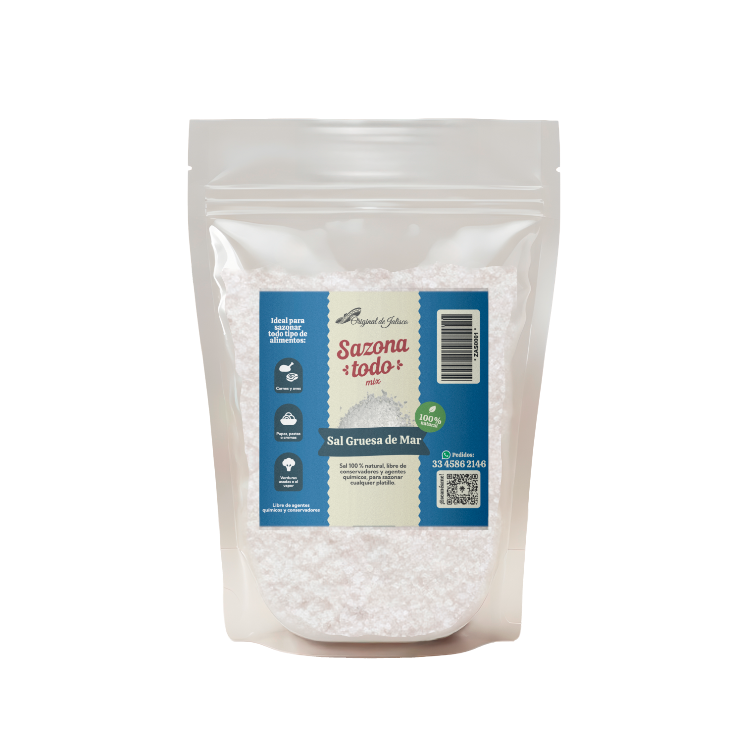 Sal 100 % natural, libre de conservadores y agentes químicos, para sazonar cualquier platillo.